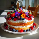 - Place the second layer on top and frost the top and sides of the cake with more whipped cream. Decorate with additional berries and edible flowers if desired.