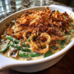 Green bean casserole is a classic American dish made primarily of green beans, cream of mushroom soup, and crispy fried onions. It’s a staple at holiday meals, especially Thanksgiving, and is enjoyed for its comforting flavors and easy preparation.