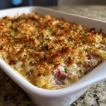This Chicken Cordon Bleu Casserole is an easy, comforting dish that combines layers of tender chicken, ham, Swiss cheese, and a creamy sauce, all topped with crispy breadcrumbs.