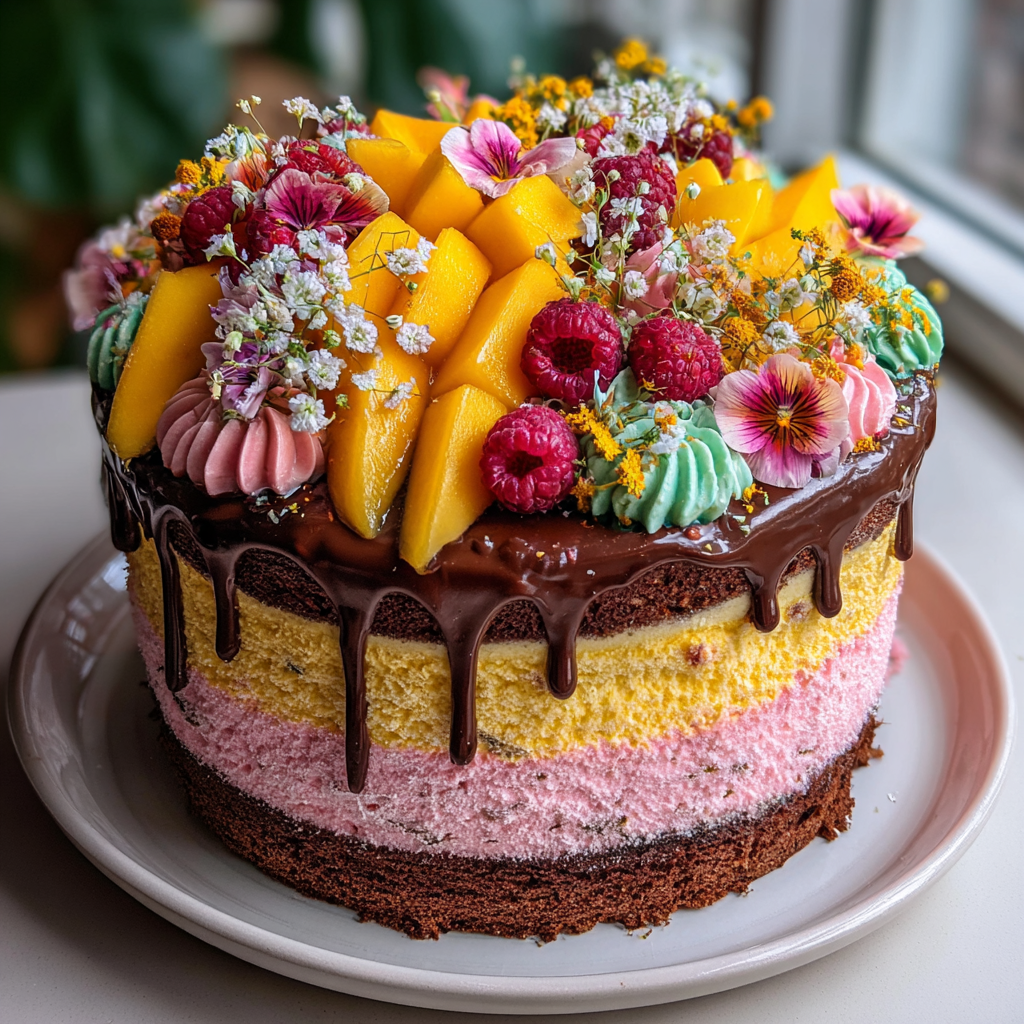 - Layer the cakes with chocolate ganache and decorate with fresh fruit and coconut flakes.