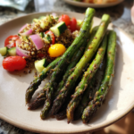 - While the asparagus is roasting, prepare the quinoa salad. In a large bowl, combine cooked quinoa, cucumber, cherry tomatoes, red onion, lemon juice, and parsley.