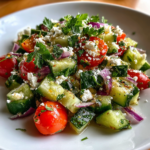 - In a large bowl, combine the diced cucumbers, cherry tomatoes, red onion, feta cheese, and parsley.