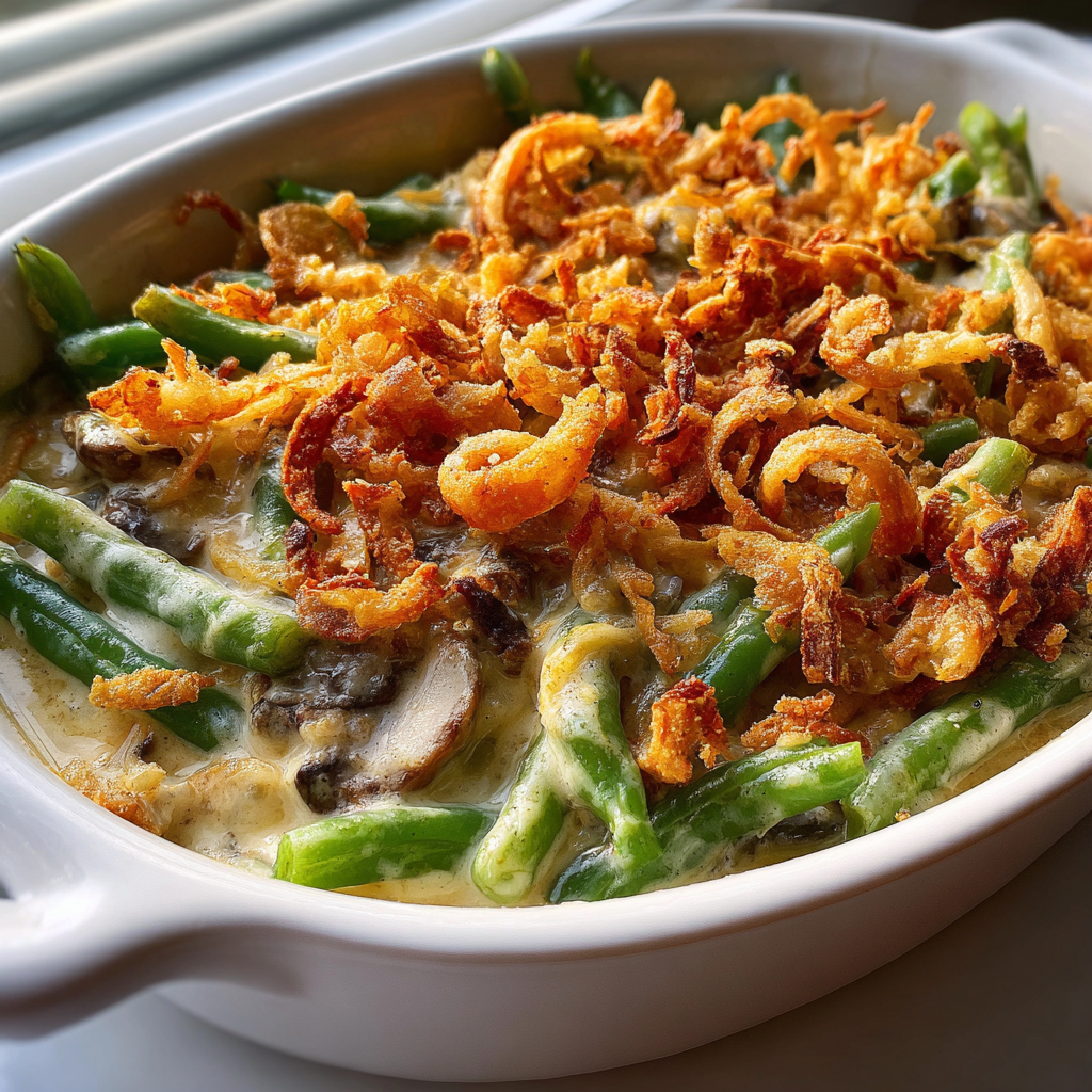This easy green bean casserole is a classic dish made with fresh green beans, creamy mushroom soup, and crispy fried onions. Perfect for holidays or family gatherings!
