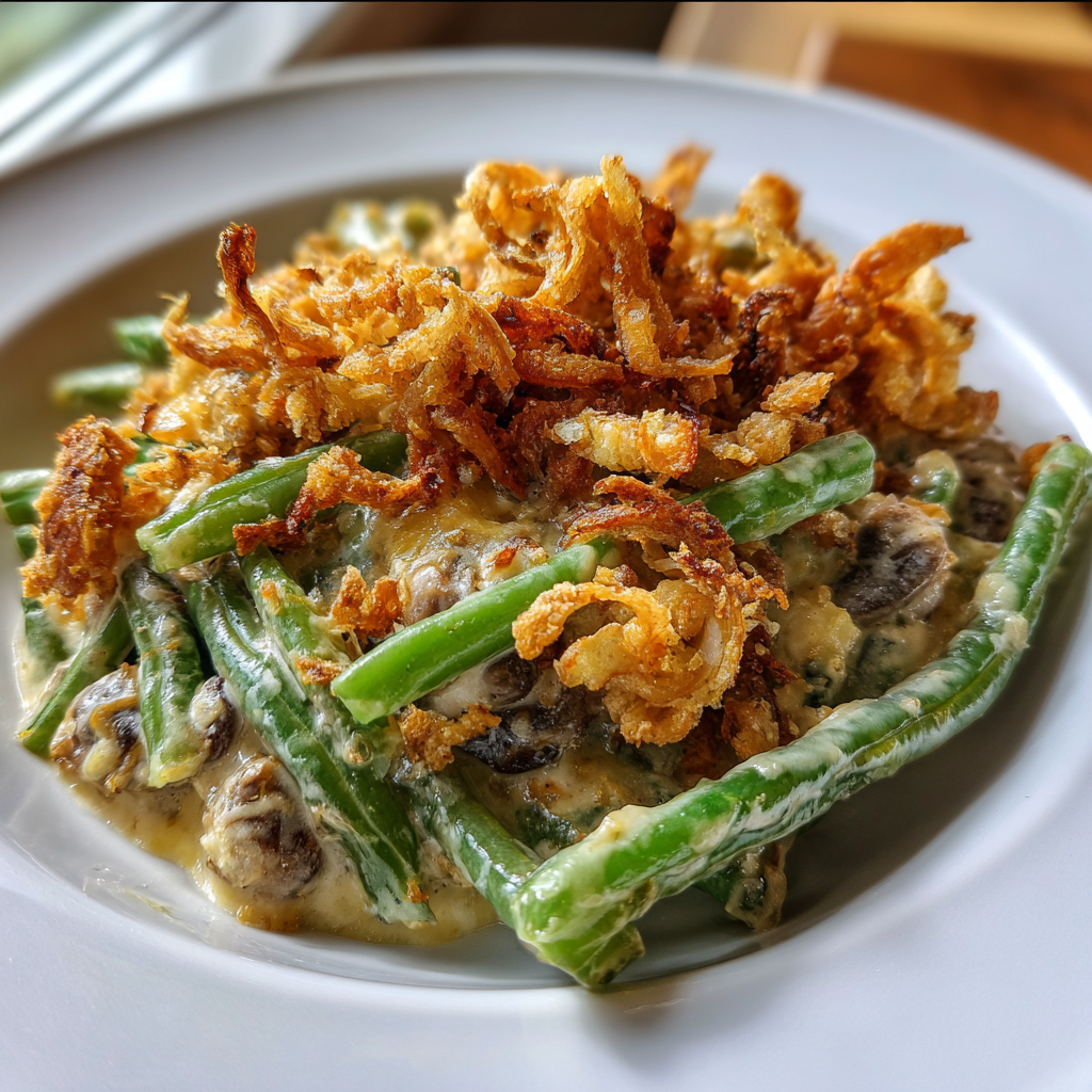 A classic green bean casserole made with fresh green beans, creamy mushroom soup, and topped with crispy fried onions.