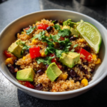 - In a large bowl, combine cooked quinoa, black beans, corn, red bell pepper, and avocado.