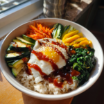- Drizzle the sauce over the bibimbap and sprinkle with sesame seeds and green onions.