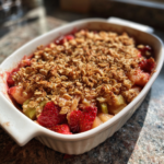 - Bake in the preheated oven for 30-35 minutes, or until the topping is golden brown and the fruit is bubbling.