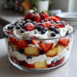 Imagine the vibrant red and blue colors of fresh strawberries and blueberries, layered with fluffy whipped cream and soft angel food cake. Each bite is a perfect blend of sweetness and freshness, creating a refreshing experience that embodies the spirit of summer. The combination of textures—from the lightness of the whipped cream to the softness of the cake—will have your taste buds dancing with joy.