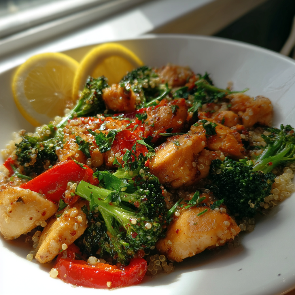 - Fluff the cooked quinoa with a fork and serve on plates topped with the chicken and vegetable mixture.
