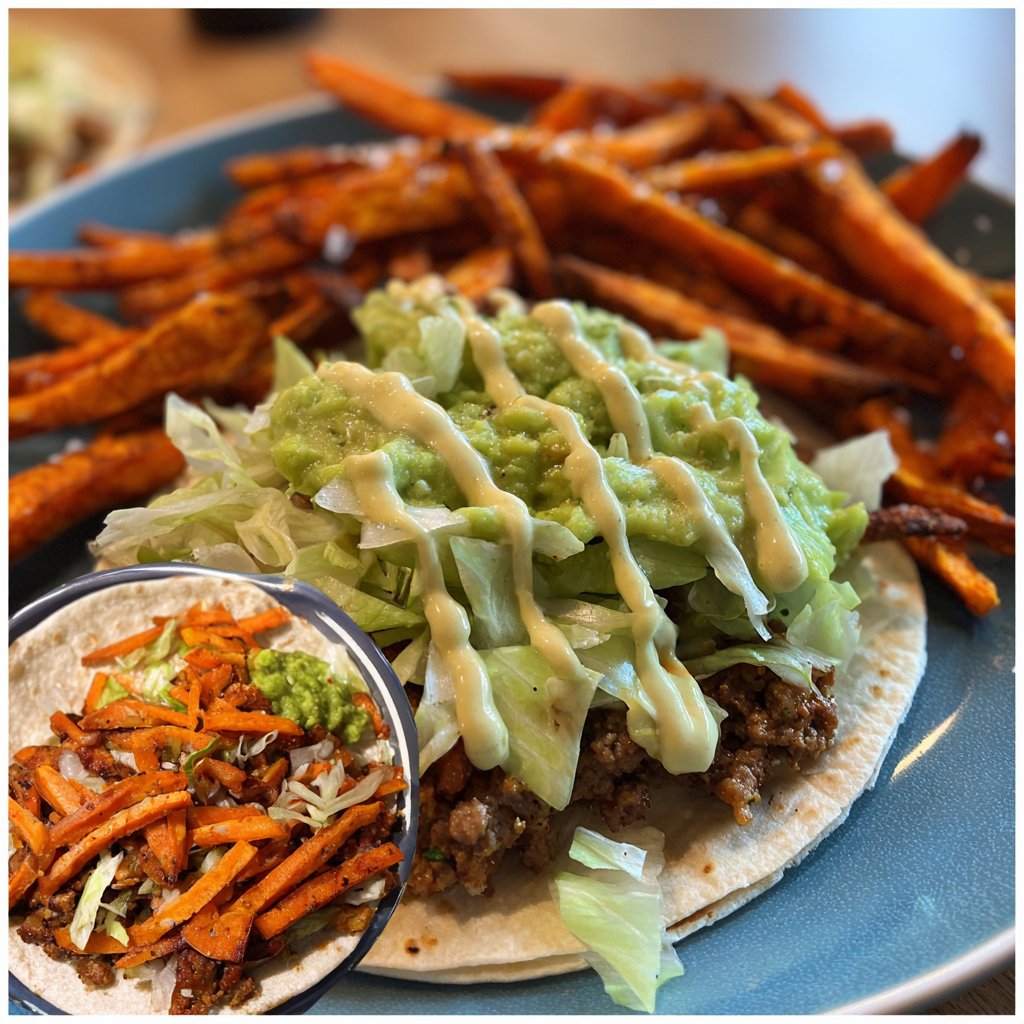 The smash burger originated in the United States, celebrated for its technique of smashing ground beef onto a hot skillet to maximize browning, flavor, and crispiness. On the other side, tacos trace their roots to Mexican cuisine, where tortillas cradle a variety of fillings, offering layers of flavor in every bite. The fusion of these two iconic dishes gives birth to the Smash Burger Taco, combining American indulgence with Mexican street food charm. When paired with the natural sweetness and slight spice of oven-baked sweet potato fries, the result is not only delicious but also visually stunning and healthier compared to deep-fried alternatives.