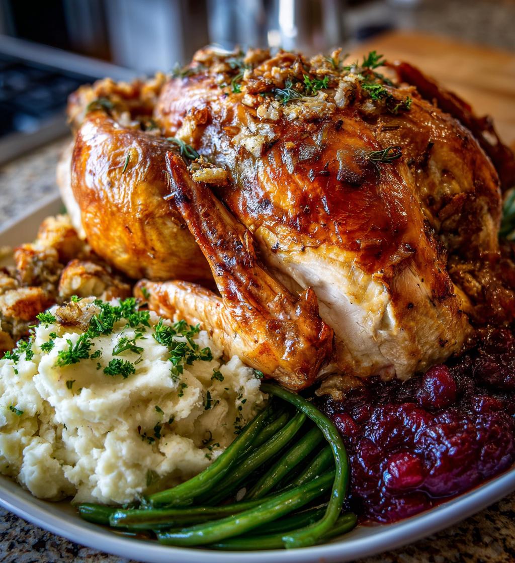 Once the turkey is out of the oven and resting (don’t forget to cover it with foil to keep it warm!), it’s time to plate up! Serve slices of that glorious turkey with a generous scoop of stuffing, alongside vibrant green beans and a heap of fluffy mashed potatoes. Don’t forget to add that tangy cranberry sauce on the side—it’s the perfect pop of flavor! And for dessert, slice up that pumpkin pie; it’s the cherry on top of your Thanksgiving spread. Wow, your guests are in for a treat!
