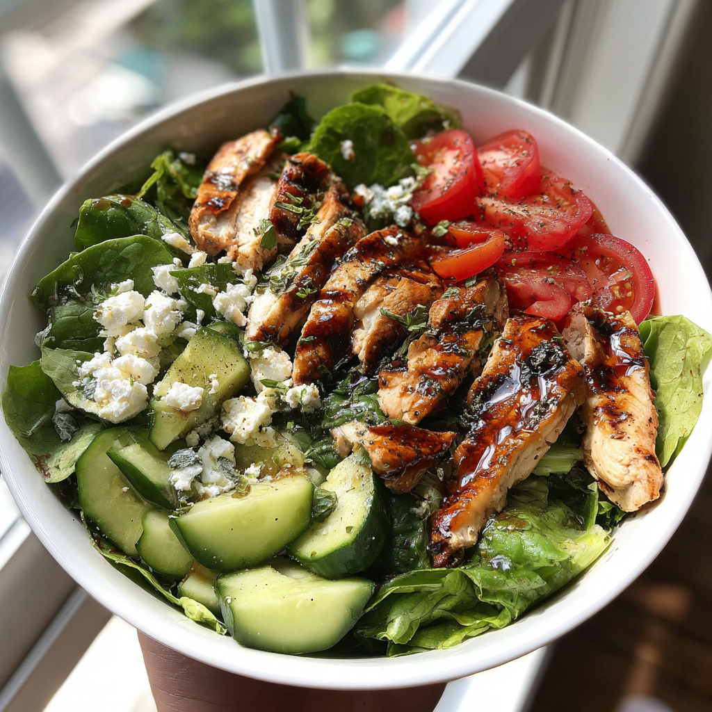 - Assemble your wrap or sandwich by layering **mixed greens**, sliced chicken, **avocado**, **cherry tomatoes**, and **cucumber**.